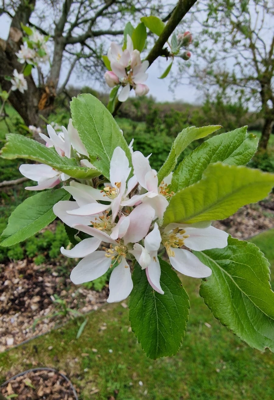 The apple trees, once bare and stark against the grey winter sky, now burst forth in soft pink and white blossoms. I love the way they drift in the air like snow on a windy day, although given how many windy days we have I am also surprised that the tree holds blossoms at all.