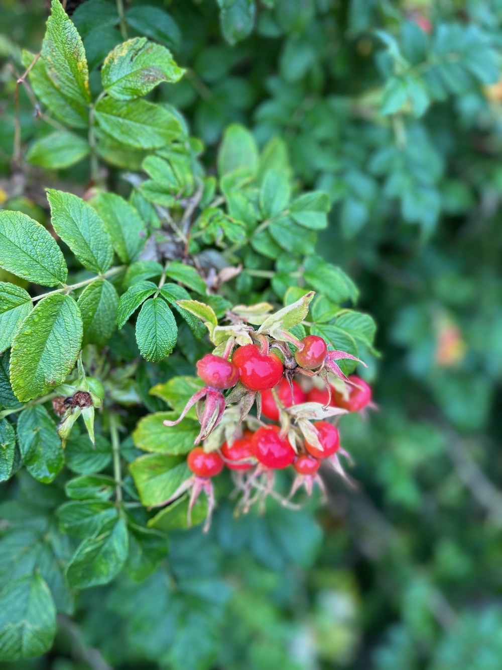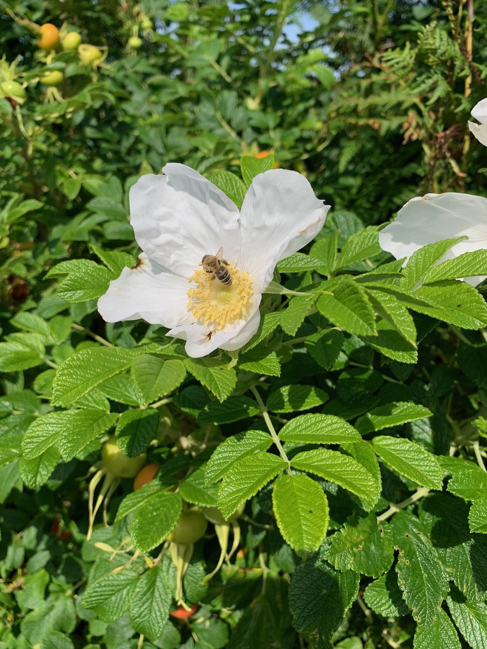 All this work is worth it though, as come summer we are all rewarded with a stunning display of pink and white roses and their beautiful scent, and the hedge is alive with the buzzing of bees. As the season progresses towards autumn, the blooms are replaced with luscious scarlet rosehips, which attract all sorts of birds and insects.